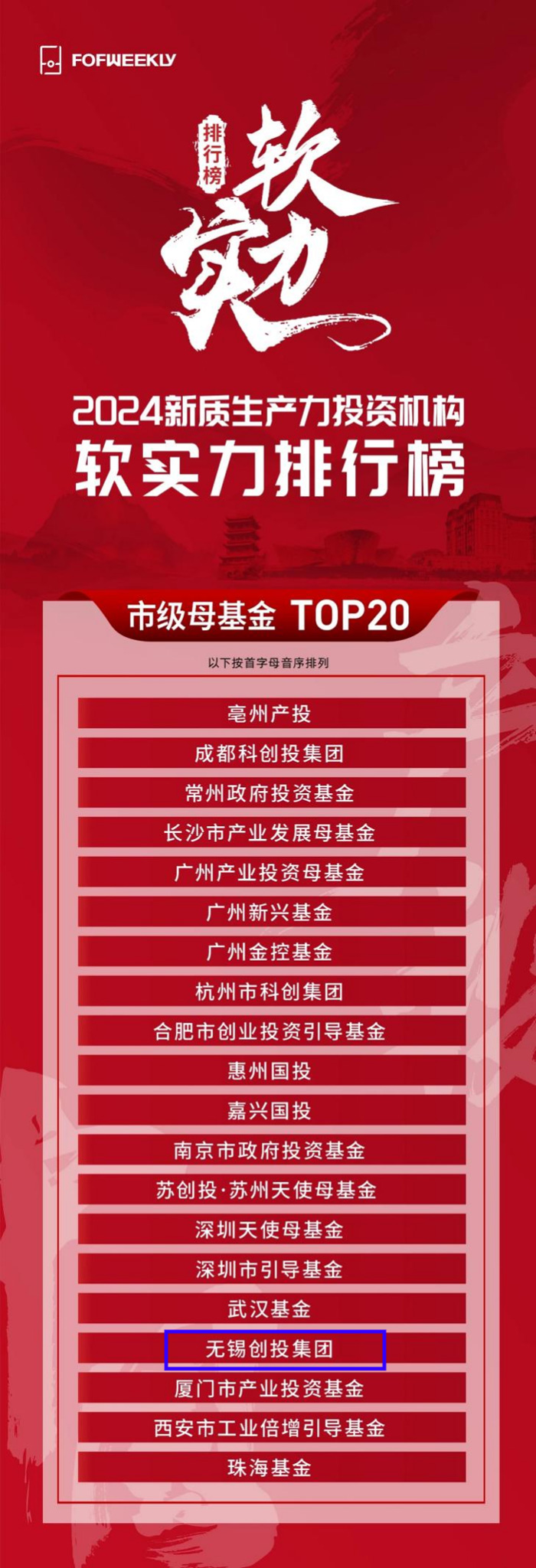 近日,《母基金周刊》(FOFWEEKLY)公布其年度排名“2024新質(zhì)生產(chǎn)力投資機構(gòu)軟實力排行榜”,無錫創(chuàng)投集團榮登“2024新質(zhì)生產(chǎn)力投資機構(gòu)軟實力排行榜—市級母基金 TOP20”。